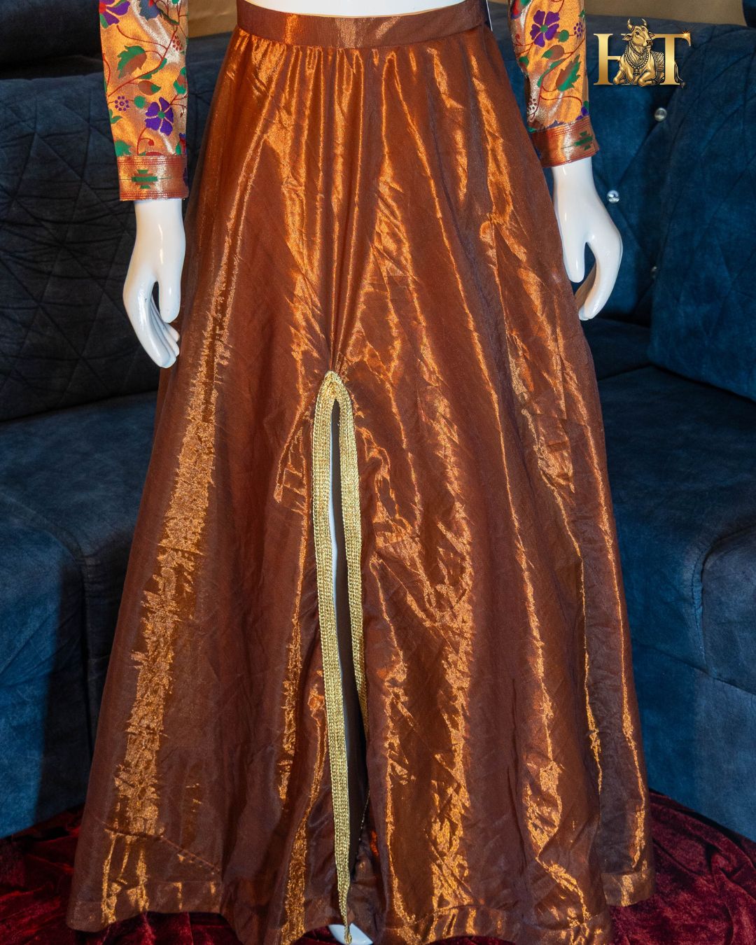 Paired with a lustrous space silk drape skirt in a rich copper tone, the look exudes understated luxury and fluid sophistication. The smooth texture and subtle sheen of the skirt beautifully complement the ornate craftsmanship of the top, creating a balanced fusion look.