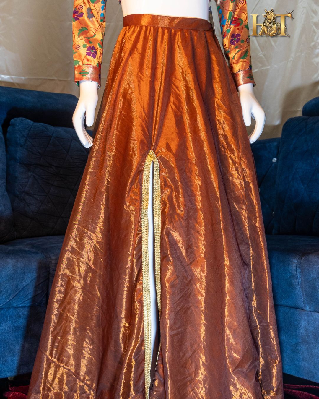 Paired with a lustrous space silk drape skirt in a rich copper tone, the look exudes understated luxury and fluid sophistication. The smooth texture and subtle sheen of the skirt beautifully complement the ornate craftsmanship of the top, creating a balanced fusion look.