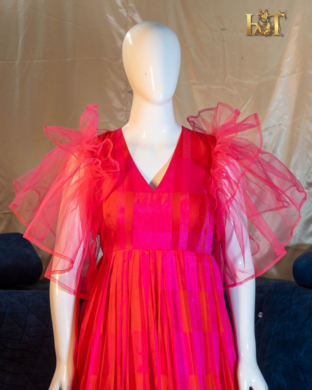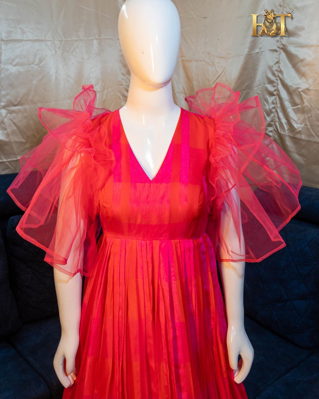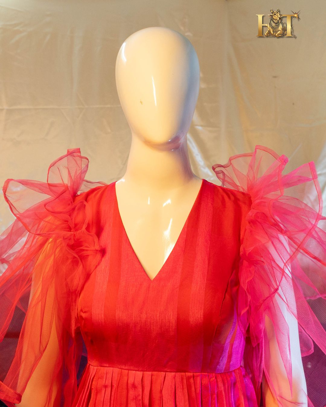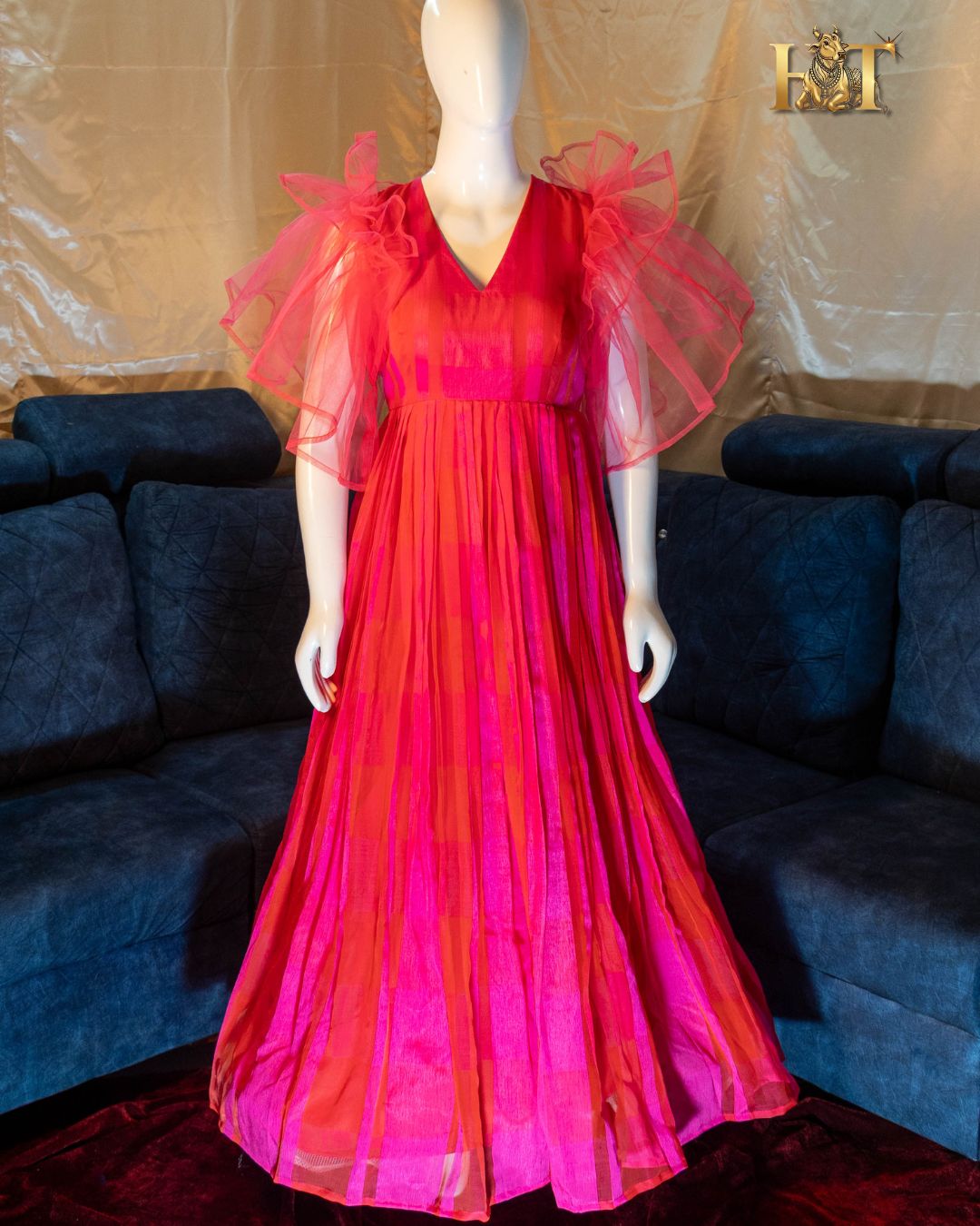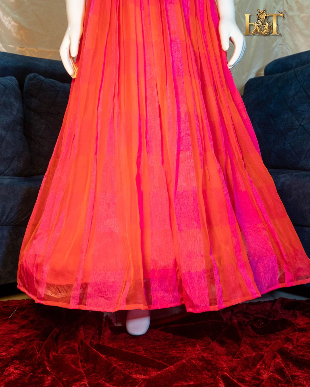 - Fabric: Lightweight Georgette with Dual-Tone Red & Pink Design