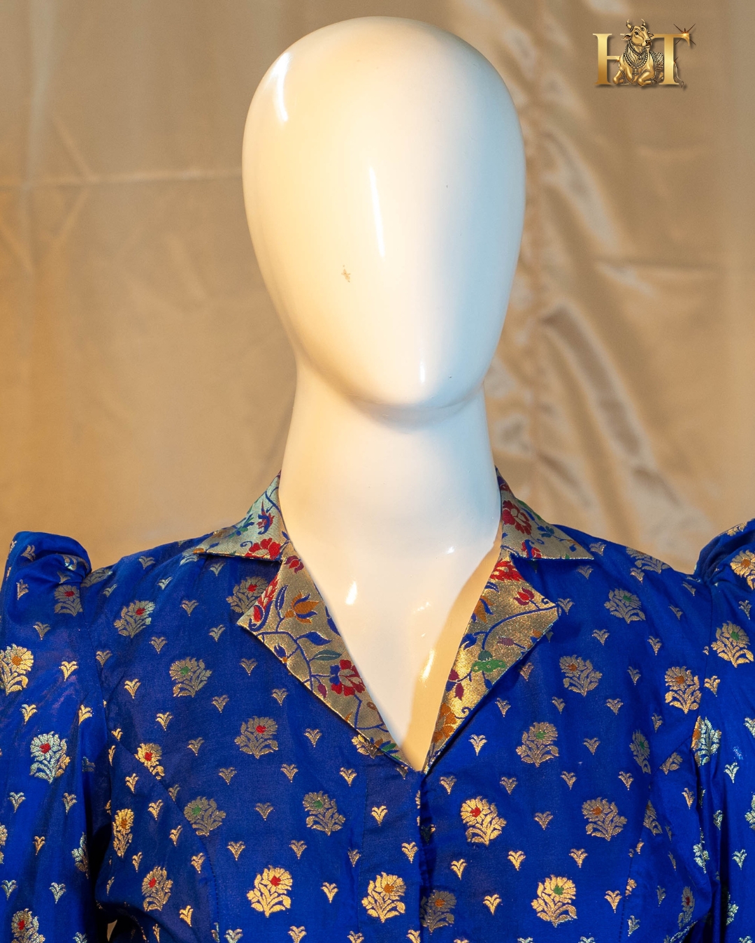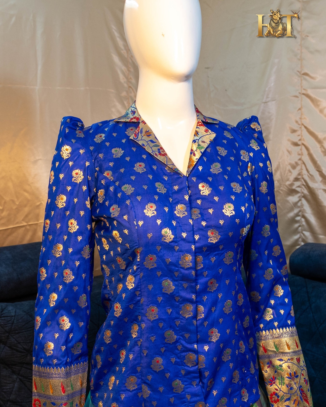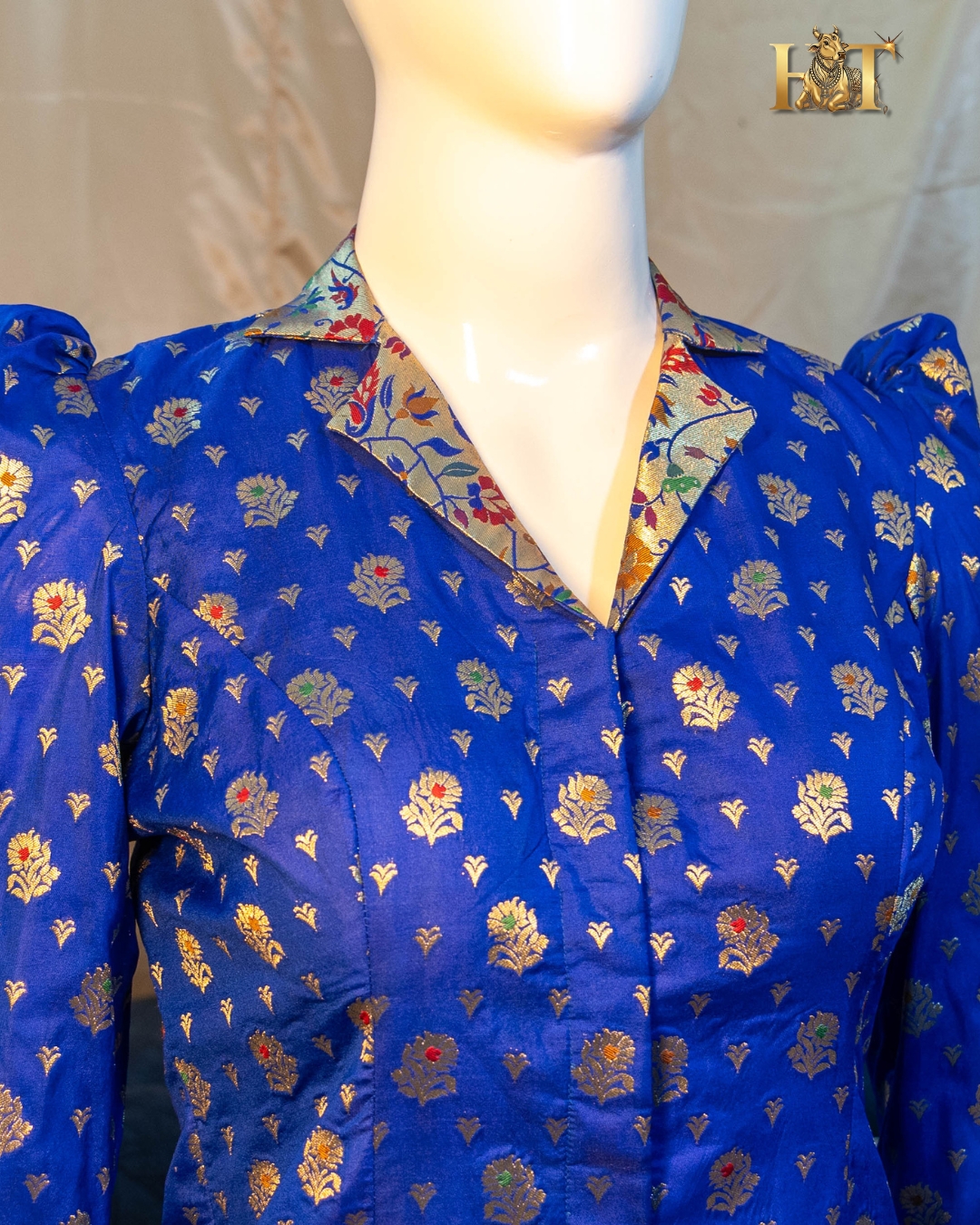 • Top: Banarasi Silk with Zari Weaving (Tailored Indo-Western Suit Style)