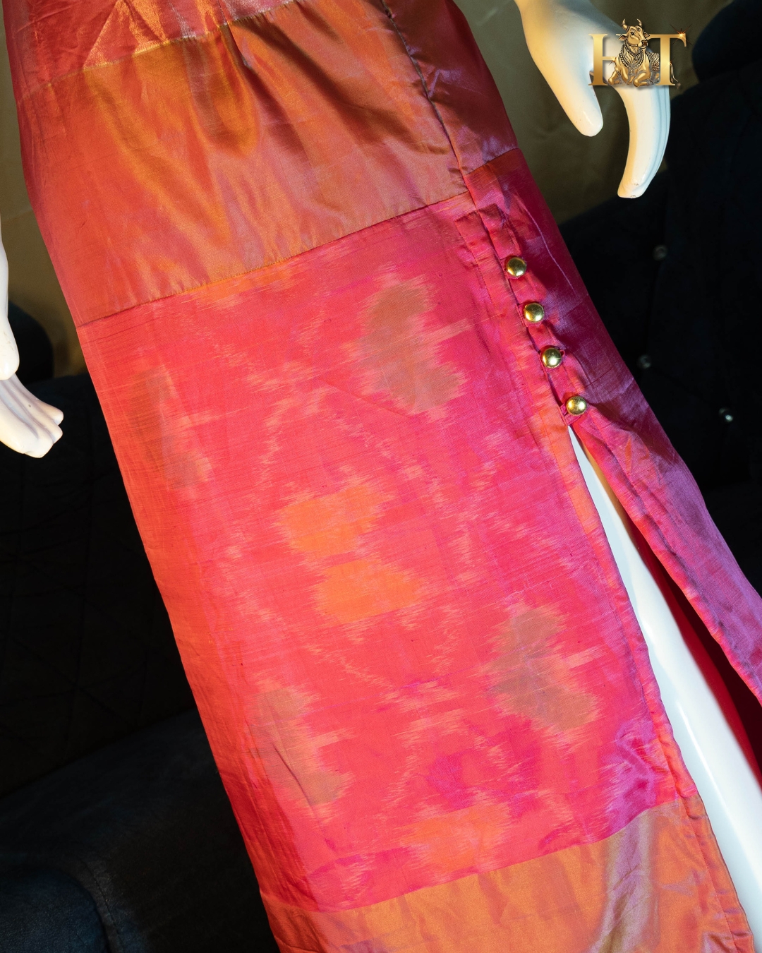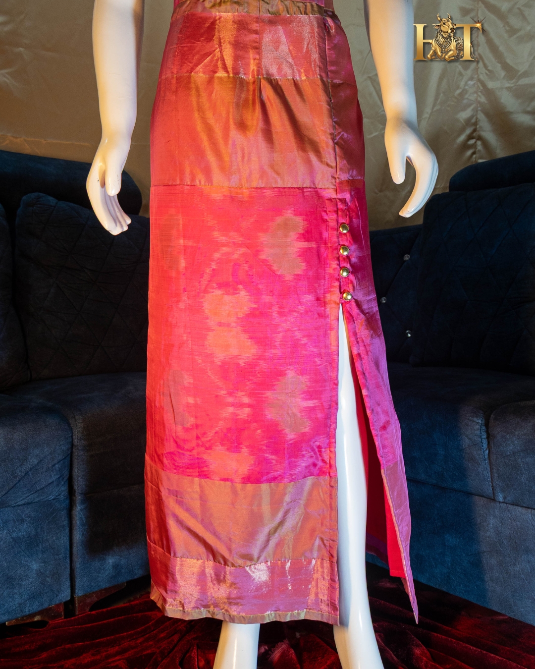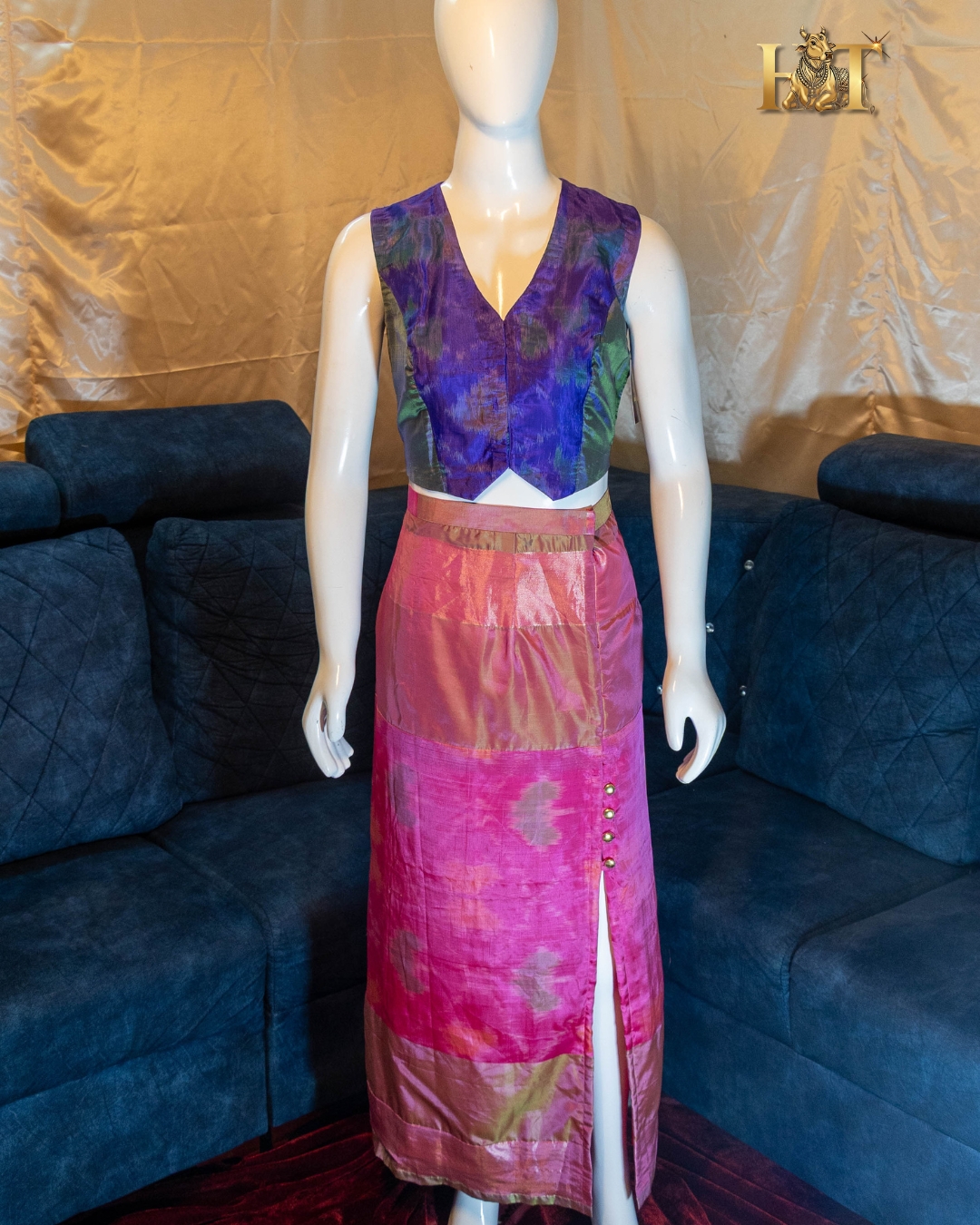 Step into the spotlight with our Ikkat Street Style Top and Thigh-Slit Modern Skirt, a chic fusion of traditional artistry and contemporary fashion. The Ikkat Top, crafted from handwoven fabric, showcases vibrant patterns that celebrate India’s timeless weaving heritage, styled with a modern streetwear edge. Paired with a sleek thigh-slit skirt, this outfit exudes bold confidence and effortless grace — making it the perfect choice for fashion-forward women who love to make a statement at parties, events, or casual luxury gatherings.