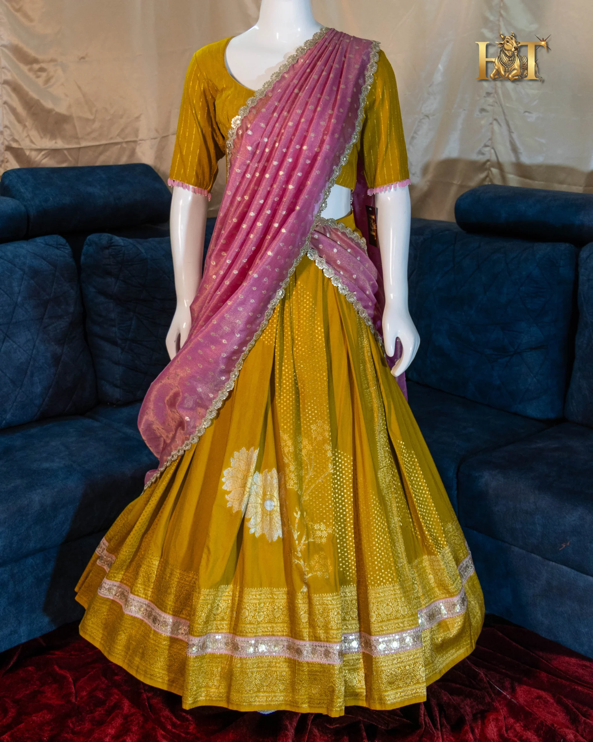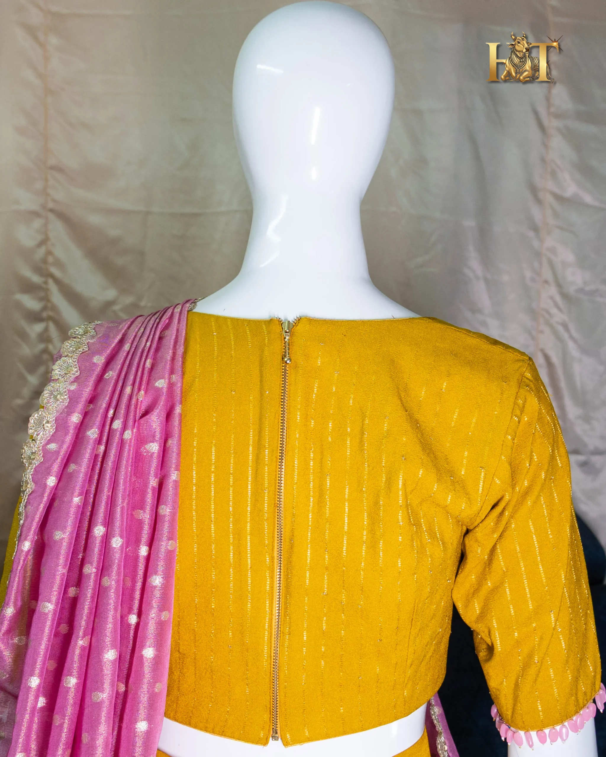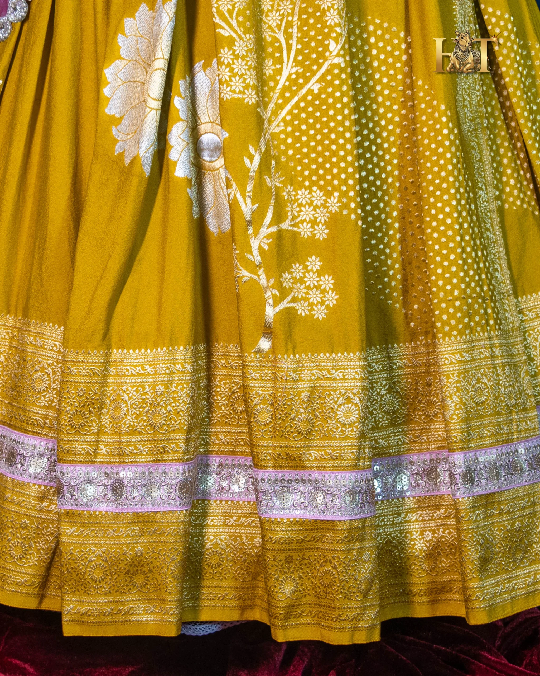 The contrasting pink dupatta, detailed with a shimmering border, adds a pop of elegance to the lehenga’s rich golden tone, creating a mesmerizing balance of color, texture, and tradition.