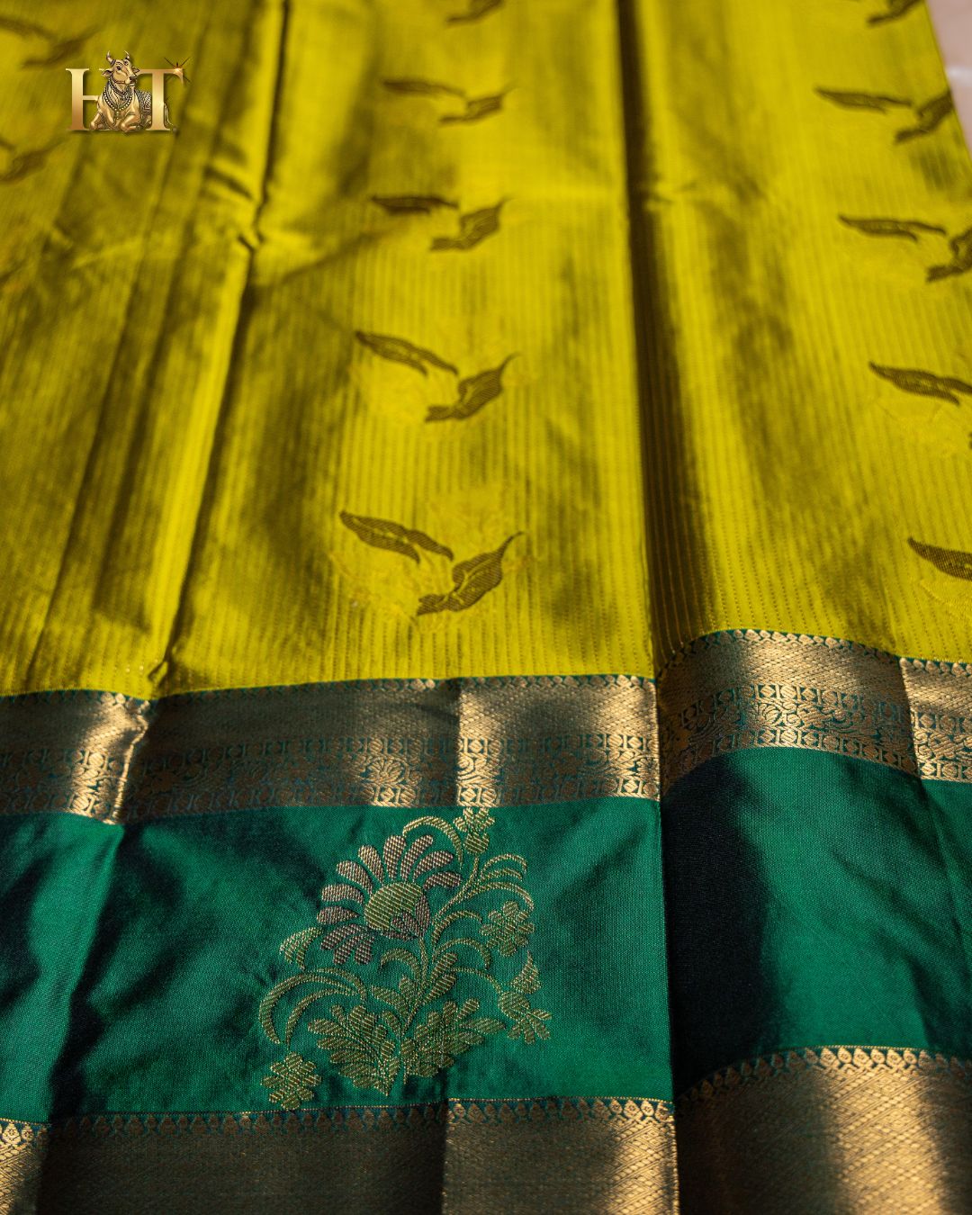 What sets this saree apart is its distinctive gap border design, highlighted with intricate gold zari work that adds structure and visual depth without overpowering the body. The balanced contrast between the vibrant green silk and the ornate border creates a sophisticated, traditional aesthetic perfect for women who appreciate understated luxury and authentic silk weaves.
